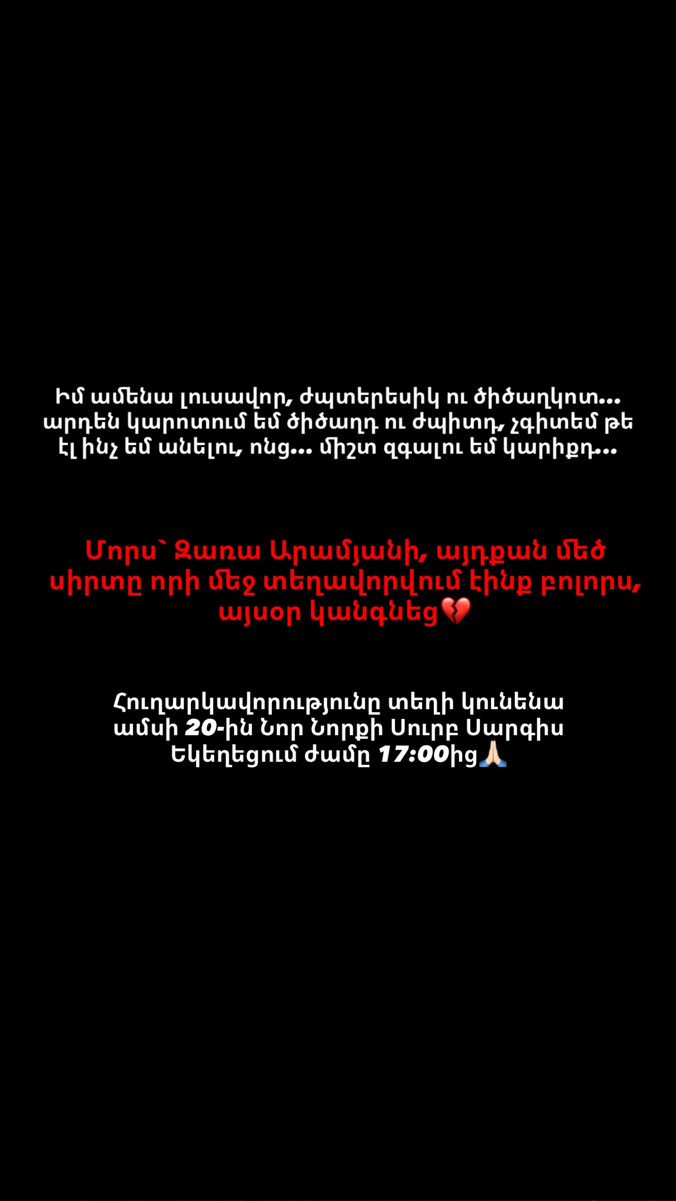 Հուղարկավորությունը տեղի կունենա ամսի 20-ին Նոր Նորքի Սուրբ Սարգիս Եկեղեցում ժամը 17:00-ից»: