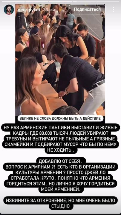 Քանի որ հայկական էջերում տարածվել են իրական կադրեր, որտեղ 80․000 մարդ մաքրում է տրիբունաները, սրբում է ոչ թե փոշոտ, այլ կեղտոտ նստարանները և հավաքում աղբը, որպեսզի վրայով չքայլեն…